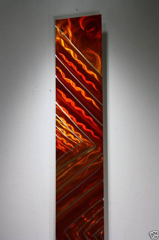 | | Abstract Painting on Metal Designed by Alex Kovacs - W56Description Abstract Painting on Metal, Wall Art, Metal Wall Sculpture, Designed by Alex Kovacs. THIS SCULPTURE IS 6" WIDE, AND 48" TALL. THE DEPTH IS 1-3/8". Availability: Some of my sculptures I have in stock and others are made to order. Either way, it will ship out in 1 to 2 weeks. My sculptures are made of the highest grade industrial aluminum available. This sculpture is not a machine shop made mass produced item. Each sculpture is original, exclusively designed and hand made by me, Alex Kovacs. The quality of my work exceeds anything you can find anywhere in the world, when it comes to this kind of metal art. The transparent anodized enamel that I use is specially developed for aluminum. The colors are protected by the "lacquer" coating that is actually urethane, blocks out the harmful ultra violet rays of the sun. The hangers and the spacers are hand fabricated from aluminum also and designed to line up the plates accurately for the multi panel wall sculptures. The "swirling" designs are hand grinded into the metal. My famous "holographic" effects that I developed in 2006 and perfected in color in this metal art form, comes to life at any light source one can imagine of, no matter how weak this light source is. This is a main feature in my work that is so often duplicated worldwide. Just about all metal artists who have decided to hijacked my style, my designs and technique, are trying to profit from this popular "merchandise". If this sculpture is available, I'll send it on its way the next day after it is purchased and paid for. If it is sold already and you like to have one, I will make it up for you. If you need any changes done to it, let me know. I could not possibly "clone" it the exact same way again, due to the fact that I make them freehand. However it is safe to say, that the one you will get will be even nicer than the sculpture in this listing, due to that I am getting better at it as the time flies by. The average sculpture takes about ten days to complete before it is in the mail, which also includes the drying time. You can feel safe and secure when purchasing my work, for the past 46 years or so I had only satisfied customers. Also, PayPal has a 100% money return policy to protect you from wrong doings and is the safest money transfer institution available worldwide. For your custom needs, please contact me. Sincerely, Alex Kovacs | If you would like to make some changes to any of my items, please contact me.