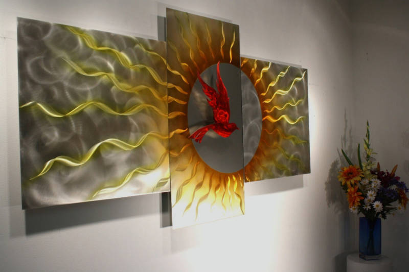 | | Metal Wall Art, Abstract Sun Metal Bird Sculpture, Designed by Alex Kovacs - W254Description Metal Wall Art, Metal Sculpture, Abstract Art, Rainbow Art, Designed by Alex Kovacs. THIS SCULPTURE IS 66" WIDE, AND 36" TALL. THE DEPTH IS 3". Availability: Some of my sculptures I have in stock and others are made to order. Either way, it will ship out in 1 to 2 weeks. My sculptures are made of the highest grade industrial aluminum available. This sculpture is not a machine shop made mass produced item. Each sculpture is original, exclusively designed and hand made by me, Alex Kovacs. The quality of my work exceeds anything you can find anywhere in the world, when it comes to this kind of metal art. The transparent anodized enamel that I use is specially developed for aluminum. The colors are protected by the "lacquer" coating that is actually urethane, blocks out the harmful ultra violet rays of the sun. The hangers and the spacers are hand fabricated from aluminum also and designed to line up the plates accurately for the multi panel wall sculptures. The "swirling" designs are hand grinded into the metal. My famous "holographic" effects that I developed in 2006 and perfected in color in this metal art form, comes to life at any light source one can imagine of, no matter how weak this light source is. This is a main feature in my work that is so often duplicated worldwide. Just about all metal artists who have decided to hijacked my style, my designs and technique, are trying to profit from this popular "merchandise". If this sculpture is available, I'll send it on its way the next day after it is purchased and paid for. If it is sold already and you like to have one, I will make it up for you. If you need any changes done to it, let me know. I could not possibly "clone" it the exact same way again, due to the fact that I make them freehand. However it is safe to say, that the one you will get will be even nicer than the sculpture in this listing, due to that I am getting better at it as the time flies by. The average sculpture takes about ten days to complete before it is in the mail, which also includes the drying time. You can feel safe and secure when purchasing my work, for the past 46 years or so I had only satisfied customers. Also, PayPal has a 100% money return policy to protect you from wrong doings and is the safest money transfer institution available worldwide. For your custom needs, please contact me. Sincerely, Alex Kovacs | If you would like to make some changes to any of my items, please contact me.