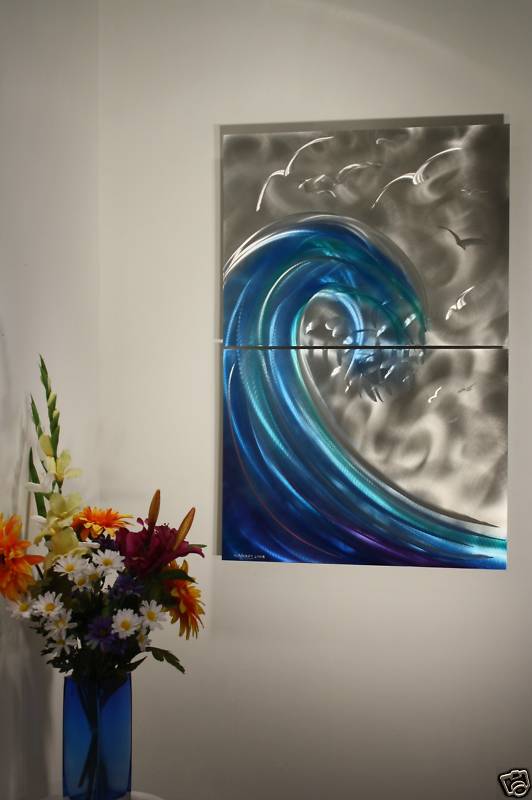 | | Ocean Wave Painting on Metal Wall Art, Design by Alex Kovacs - W171Description Ocean Wave Painting on Metal Wall Art, Modern Abstract Art, Metal Wall Sculpture,Design by New York Artist Alex Kovacs. THIS SCULPTURE IS 24" WIDE, AND 36" TALL. THE DEPTH IS 1-5/8". Availability: Some of my sculptures I have in stock and others are made to order. Either way, it will ship out in 1 to 2 weeks. My sculptures are made of the highest grade industrial aluminum available. This sculpture is not a machine shop made mass produced item. Each sculpture is original, exclusively designed and hand made by me, Alex Kovacs. The quality of my work exceeds anything you can find anywhere in the world, when it comes to this kind of metal art. The transparent anodized enamel that I use is specially developed for aluminum. The colors are protected by the "lacquer" coating that is actually urethane, blocks out the harmful ultra violet rays of the sun. The hangers and the spacers are hand fabricated from aluminum also and designed to line up the plates accurately for the multi panel wall sculptures. The "swirling" designs are hand grinded into the metal. My famous "holographic" effects that I developed in 2006 and perfected in color in this metal art form, comes to life at any light source one can imagine of, no matter how weak this light source is. This is a main feature in my work that is so often duplicated worldwide. Just about all metal artists who have decided to hijacked my style, my designs and technique, are trying to profit from this popular "merchandise". If this sculpture is available, I'll send it on its way the next day after it is purchased and paid for. If it is sold already and you like to have one, I will make it up for you. If you need any changes done to it, let me know. I could not possibly "clone" it the exact same way again, due to the fact that I make them freehand. However it is safe to say, that the one you will get will be even nicer than the sculpture in this listing, due to that I am getting better at it as the time flies by. The average sculpture takes about ten days to complete before it is in the mail, which also includes the drying time. You can feel safe and secure when purchasing my work, for the past 46 years or so I had only satisfied customers. Also, PayPal has a 100% money return policy to protect you from wrong doings and is the safest money transfer institution available worldwide. For your custom needs, please contact me. Sincerely, Alex Kovacs | If you would like to make some changes to any of my items, please contact me.