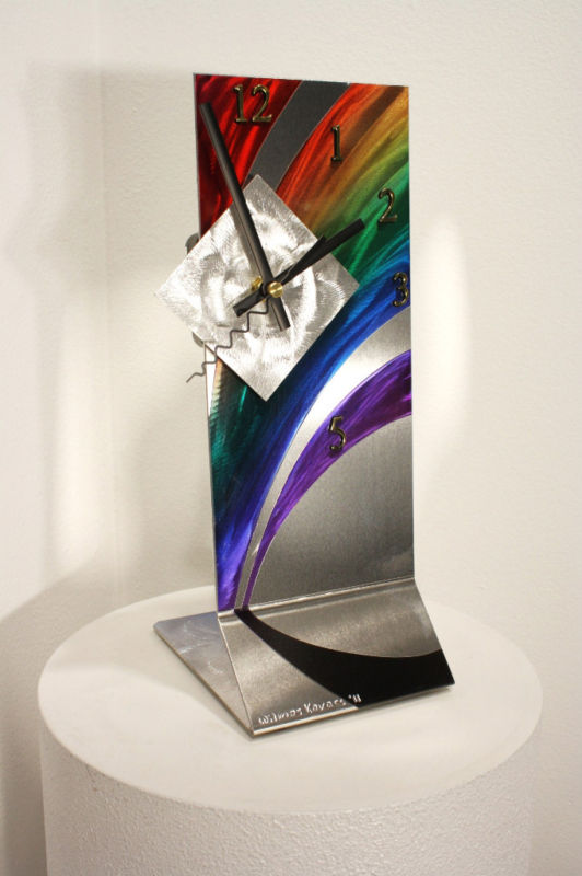 | | Rainbow Art Painted Clock, Desk Table Mantel Clock - W397Description THE ROUND BASE PLATE THAT IS SEEN ON SOME OF THE PHOTOGRAPHS CAN BE ORDERED SEPARATELY. IT CAN BE BLACK OR SILVER, OR YOU CAN CHOOSE ANY OTHER COLORS YOU MIGHT LIKE TO HAVE. IT MEASURES 8" IN DIAMETER AND IS 5/16" HIGH. IT COSTS AN ADDITIONAL 15.00. DIMENSIONS: 12" HIGH X 4-1/2" WIDE X 5" DEEP. Availability: Some of my sculptures I have in stock and others are made to order. Either way, it will ship out in 1 to 2 weeks. My sculptures are made of the highest grade industrial aluminum available. This sculpture is not a machine shop made mass produced item. Each sculpture is original, exclusively designed and hand made by me, Alex Kovacs. The quality of my work exceeds anything you can find anywhere in the world, when it comes to this kind of metal art. The transparent anodized enamel that I use is specially developed for aluminum. The colors are protected by the "lacquer" coating that is actually urethane, blocks out the harmful ultra violet rays of the sun. The hangers and the spacers are hand fabricated from aluminum also and designed to line up the plates accurately for the multi panel wall sculptures. The "swirling" designs are hand grinded into the metal. My famous "holographic" effects that I developed in 2006 and perfected in color in this metal art form, comes to life at any light source one can imagine of, no matter how weak this light source is. This is a main feature in my work that is so often duplicated worldwide. Just about all metal artists who have decided to hijacked my style, my designs and technique, are trying to profit from this popular "merchandise". If this sculpture is available, I'll send it on its way the next day after it is purchased and paid for. If it is sold already and you like to have one, I will make it up for you. If you need any changes done to it, let me know. I could not possibly "clone" it the exact same way again, due to the fact that I make them freehand. However it is safe to say, that the one you will get will be even nicer than the sculpture in this listing, due to that I am getting better at it as the time flies by. The average sculpture takes about ten days to complete before it is in the mail, which also includes the drying time. You can feel safe and secure when purchasing my work, for the past 46 years or so I had only satisfied customers. Also, PayPal has a 100% money return policy to protect you from wrong doings and is the safest money transfer institution available worldwide. For your custom needs, please contact me. Sincerely, Alex Kovacs | If you would like to make some changes to any of my items, please contact me.