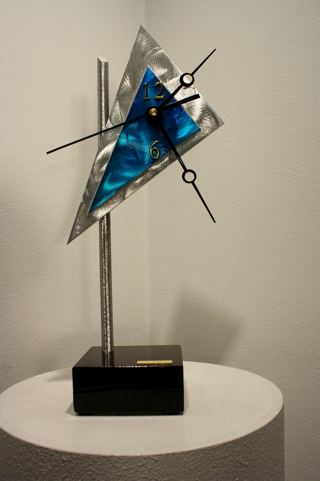 | | Alex Kovacs Abstract Decor Painting on Metal Table Sculpture Mantel Desk Clock - W551Description DIMENSIONS: 13" HIGH X 6-1/2" WIDE X 3-1/2" DEEP. Availability: Some of my sculptures I have in stock and others are made to order. Either way, it will ship out in 1 to 2 weeks. My sculptures are made of the highest grade industrial aluminum available. This sculpture is not a machine shop made mass produced item. Each sculpture is original, exclusively designed and hand made by me, Alex Kovacs. The quality of my work exceeds anything you can find anywhere in the world, when it comes to this kind of metal art. The transparent anodized enamel that I use is specially developed for aluminum. The colors are protected by the "lacquer" coating that is actually urethane, blocks out the harmful ultra violet rays of the sun. The hangers and the spacers are hand fabricated from aluminum also and designed to line up the plates accurately for the multi panel wall sculptures. The "swirling" designs are hand grinded into the metal. My famous "holographic" effects that I developed in 2006 and perfected in color in this metal art form, comes to life at any light source one can imagine of, no matter how weak this light source is. This is a main feature in my work that is so often duplicated worldwide. Just about all metal artists who have decided to hijacked my style, my designs and technique, are trying to profit from this popular "merchandise". If this sculpture is available, I'll send it on its way the next day after it is purchased and paid for. If it is sold already and you like to have one, I will make it up for you. If you need any changes done to it, let me know. I could not possibly "clone" it the exact same way again, due to the fact that I make them freehand. However it is safe to say, that the one you will get will be even nicer than the sculpture in this listing, due to that I am getting better at it as the time flies by. The average sculpture takes about ten days to complete before it is in the mail, which also includes the drying time. You can feel safe and secure when purchasing my work, for the past 46 years or so I had only satisfied customers. Also, PayPal has a 100% money return policy to protect you from wrong doings and is the safest money transfer institution available worldwide. For your custom needs, please contact me. Sincerely, Alex Kovacs | If you would like to make some changes to any of my items, please contact me.
